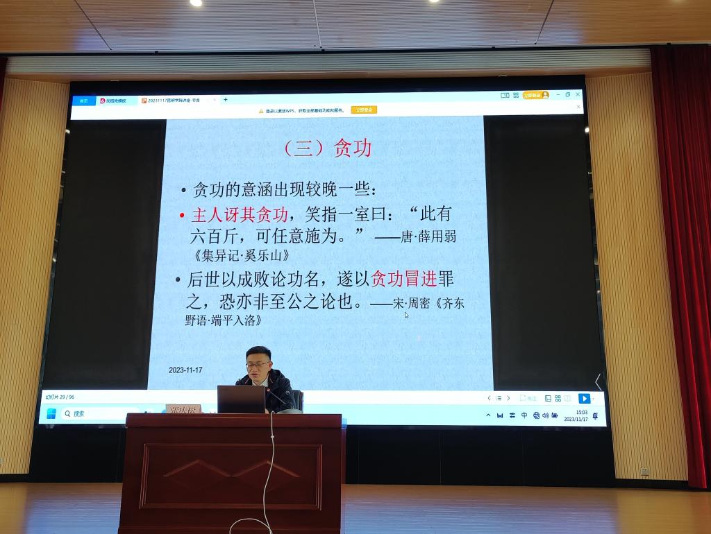 张教授从“贪”的意涵演变史、中国传统文化中的“节贪”思想、马克思主义对“贪”的态度以及“节贪”思想的当代赓续四个方面进行讲述和分析。张教授运用大量文献和具体事例,直观展示了“贪”的内涵演变及其外延指向;从中国传统文化角度阐释和总结了“节贪”思想的精华,并引用马克思主义经典论著呈现了马克思主义对“贪”欲持鄙视的态度,最后从道德反腐、制度反腐、提薪养廉等角度呈现了当代反贪的三种路径以及历史上存在的反贪反腐的制度。张教授勉励老员工要通过读书、运动、合理规划老员工活等祛除贪念、修养内心,充实老员工活,不断发展自身。